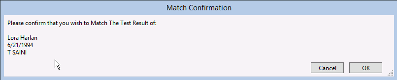 After the patient is matched via the demographic data, clicking the MATCH button by the correct patient associates the test with that patient and removes the test result from the Unmatched Test Results column. A Match Confirmation window will populate.