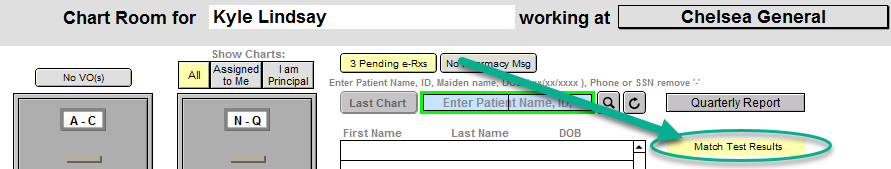 Chart Room Buttons: A yellow button appears at the top when a lab interface has been activated for the group. Example of Match Test Results button (yellow button):