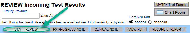 If the STAFF REVIEW button has been clicked, the clinician will see that button displayed in green.