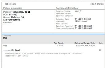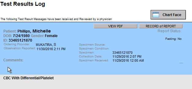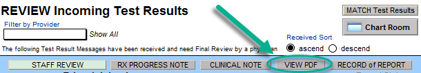 VIEW PDF: Clicking this button allows the reviewer to see the PDF report generated by the lab. Anyone who has the appropriate permission can view the PDF document. Please not that not all lab interfaces include a PDF report with the results, and in those cases, when the view PDF button is clicked nothing will happen.
