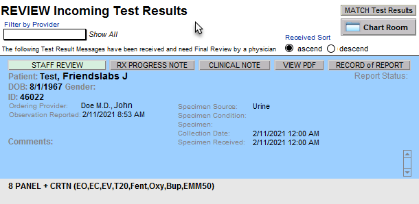 This is the screen that displays when you click the Review Test Results button from the Chart Room: