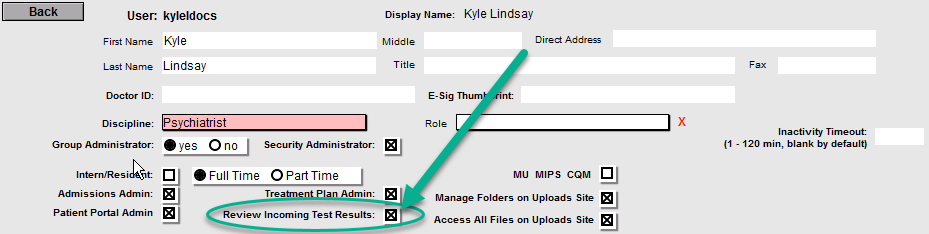 To allow users to review incoming lab results, open the Security Center in Settings & Directories. Find the user, click Edit to the right of the name, and check the box labeled “Review Incoming Test Results.”