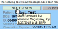 Green STAFF REVIEW button = staff has reviewed. Hovering over the button will indicate who reviewed the results and when.