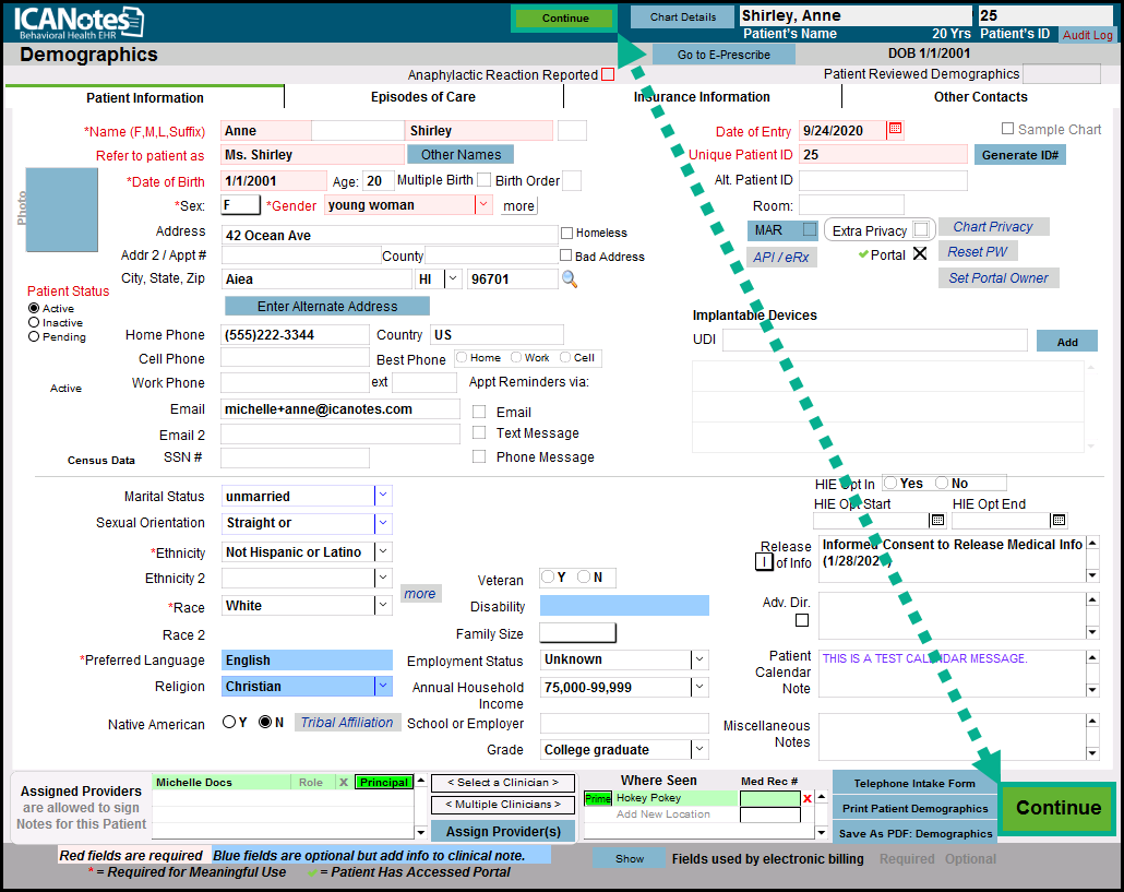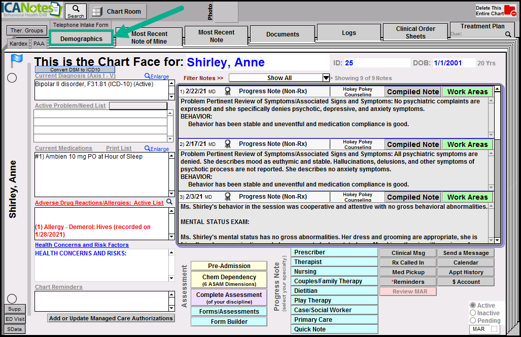 1. From the patient's Chart Face Click on Demographics tab.