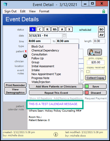 5. The text will then appear on the Appointment Book, both at the top of the left hand column, and in any Event Details dialog box for this patient (see below).