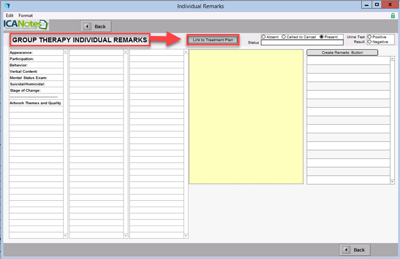 Individual Remarks from the Therapy Groups module (accessible via the Chart Room):