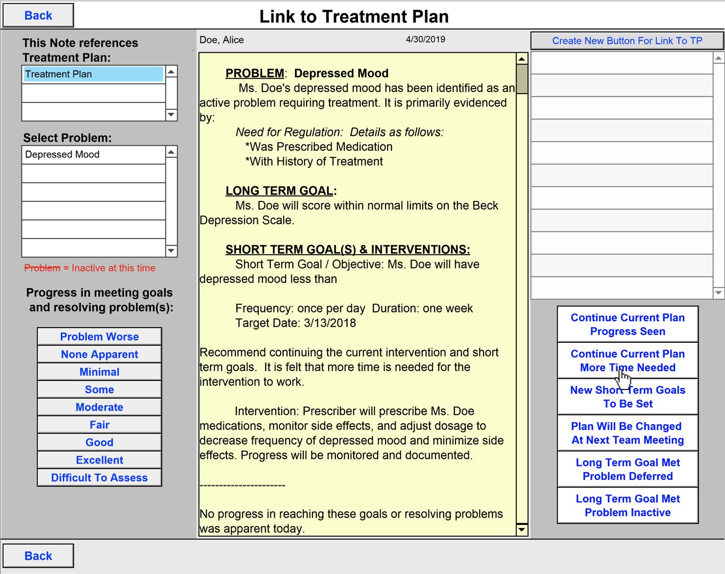 Each Link to Treatment Plan button leads to a screen that looks like this: