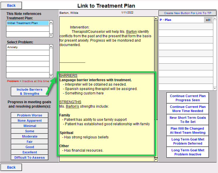3. Click Include Barriers & Strengths to populate the information from the treatment plan into the progress note.