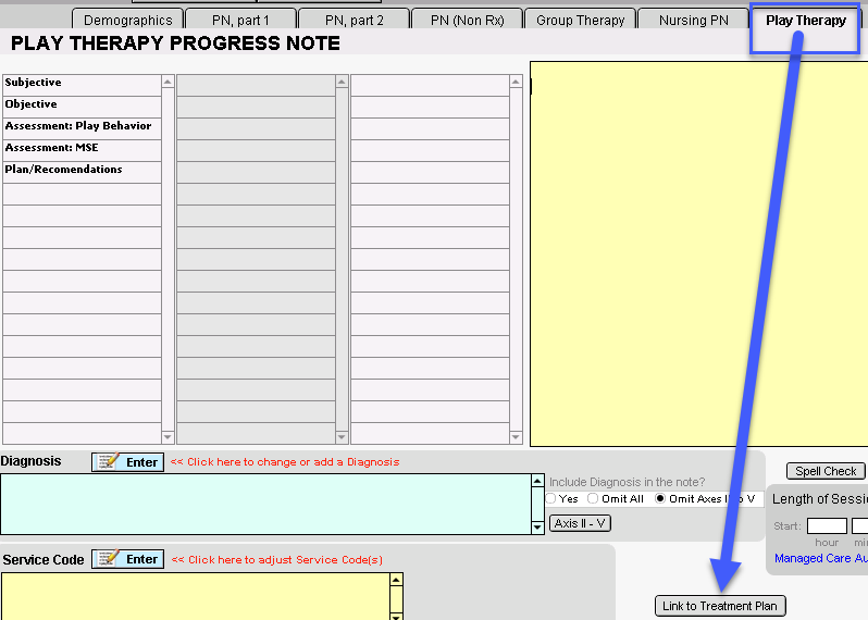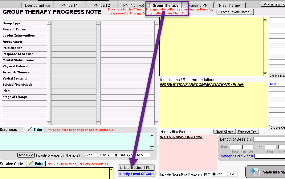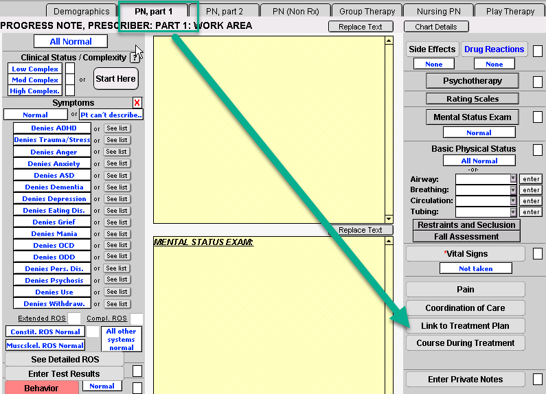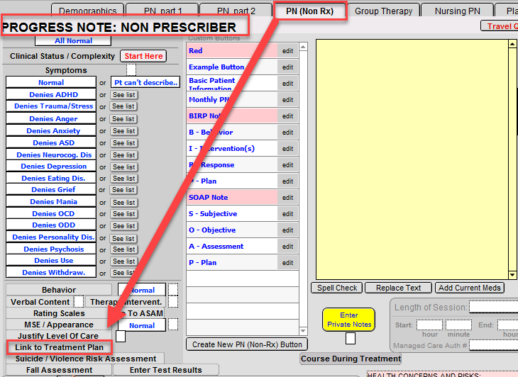It can be done from a variety of tabs within the Progress Notes. The locations of the Link To Treatment Plan button within each Progress Note tab: