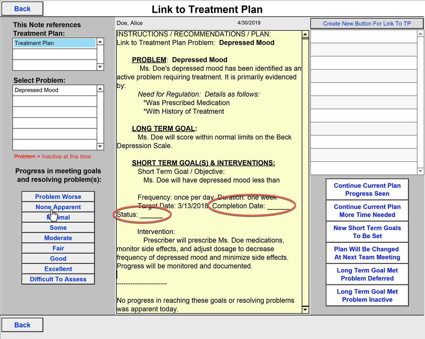4. My patient did not have any progress on her treatment so I selected the None Apparent button. This patient needs more time for success. Also, within the yellow type-in field the completion date and status show with blanks. Since neither of these are met yet, I'm going to delete them from the field.