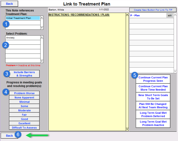 - Click the Back button to return to the note work areas.