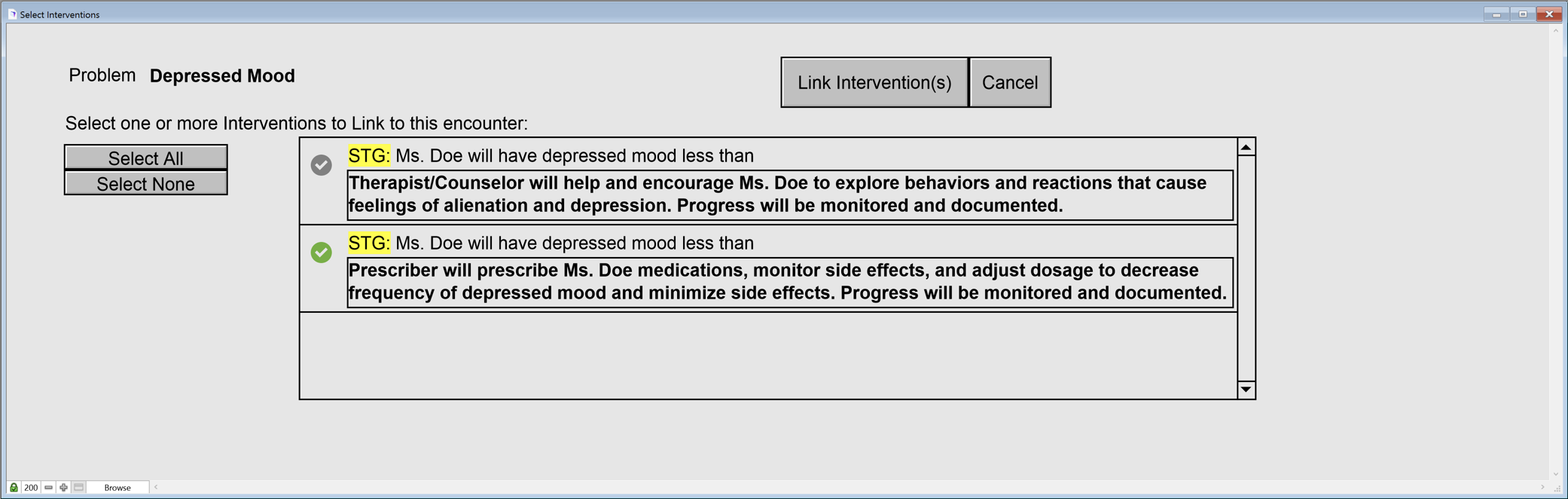 2. When I clicked on the problem (step 2 indicated in the screenshot above), I am brought to the Select Interventions screen. In here, I can choose all interventions or some. The green checkmarks next to the STG (short term goal) indicate that that intervention is chosen. If the checkmark is gray, it will not show on the note. Once you have decided which intervention(s) was done during the appointment, click the Link Intervention(s) button.