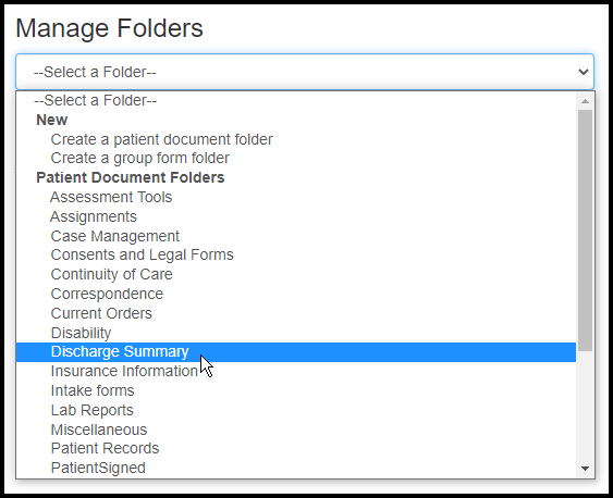 1. In the dropdown menu, select "Create a patient document folder" (or Create a group form folder).