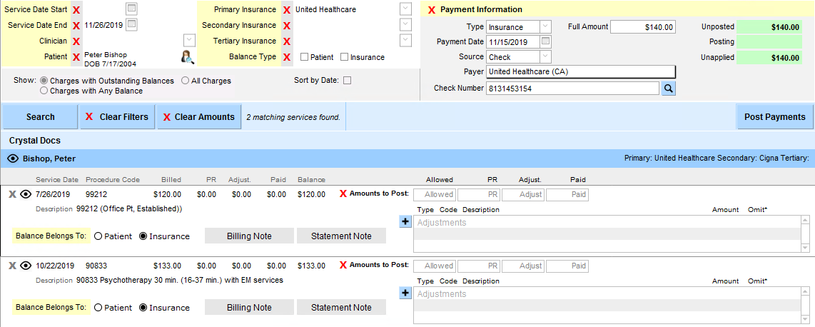 Use the patient search filters at the top left to search for all applicable patients related to the insurance payment you are posting/in the EOB. Filters for Service Date, Clinician, Insurance, and Balance Type, as well as the ‘Show’ options underneath (Charges with Outstanding Balances, Charges with Any Balance, All Charges and Show Clinicians) can be used together to find all patients on the EOB.