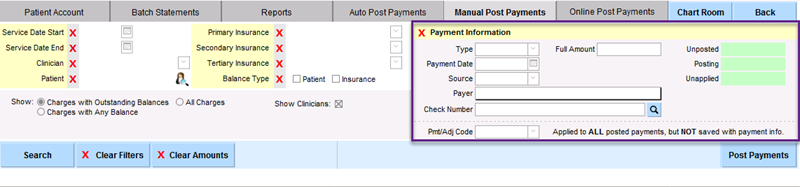 Start by navigating to Patient Accounts from the Chart Room, then Manual Post Payments