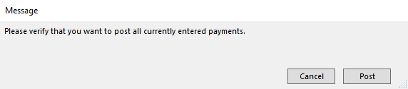 You’ll be prompted with a confirmation: Please verify that you want to post all currently entered payments