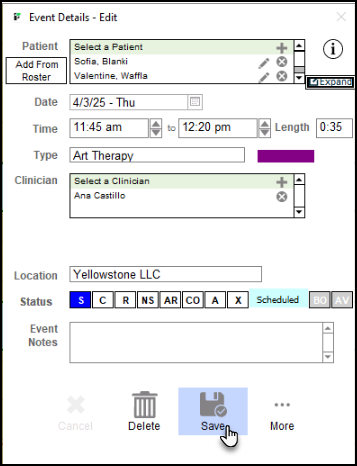I can select a patient from the patient window by (a) clicking the magnifying glass and bringing up the find patient window. (b) Type in search criteria and search for the patient. (c) When you find the patient, click on his or her name and the patient will be shown on the calendar patient window.