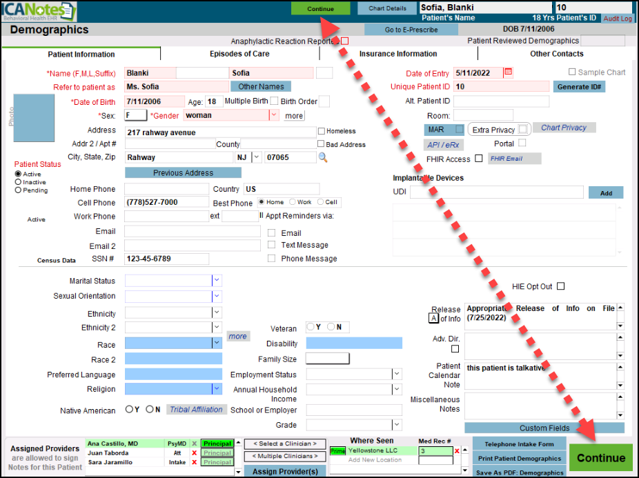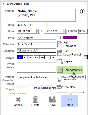 If you want to update the phone number for a patient, you can do that as well from the appointment by going to Demographics.