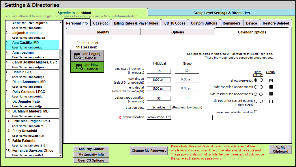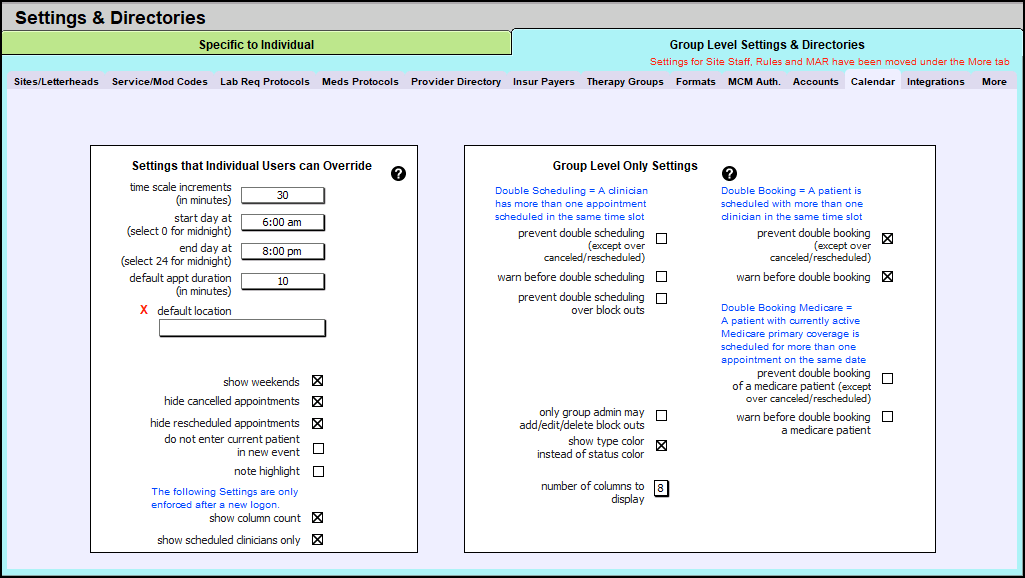There are individual and group settings available in Settings + Directories and in the New Calendar.