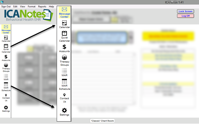 Action buttons for accessing the Message Center, Calendar and Patient Accounts, Therapy Groups and the MAR for inpatient facilities, have been relocated to the left-side of the Chart Room. Settings and Directories has been renamed to Settings, can can be found at the bottom of the left hand navigation menu.