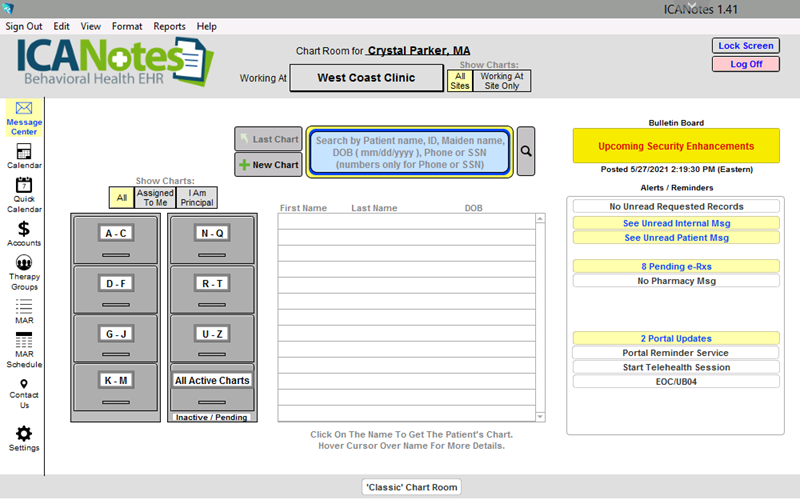 ICANotes is pleased to introduce an updated Chart Room designed to improve efficiency in the user experience. Security Administrators should contact ICANotes Support via phone or email to inquire about enabling the New Chart Room for their account.