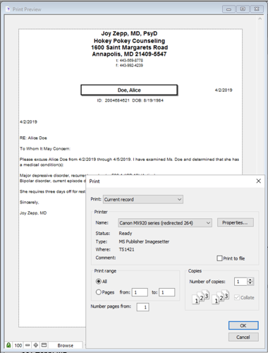 3. Selecting a clinician name for 'Name on Form Letter' and/or adjusting the Location with 'Location on Form Letter'
