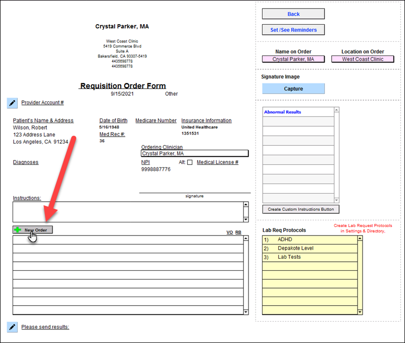5. Once the test requisition is ordered, it will show on the Lab Requisition Order Form. Continue adding as many New Orders as needed by following the same steps outlined above.