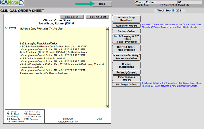 to return to the Clinical Order Sheet, then click Back to return to the note.