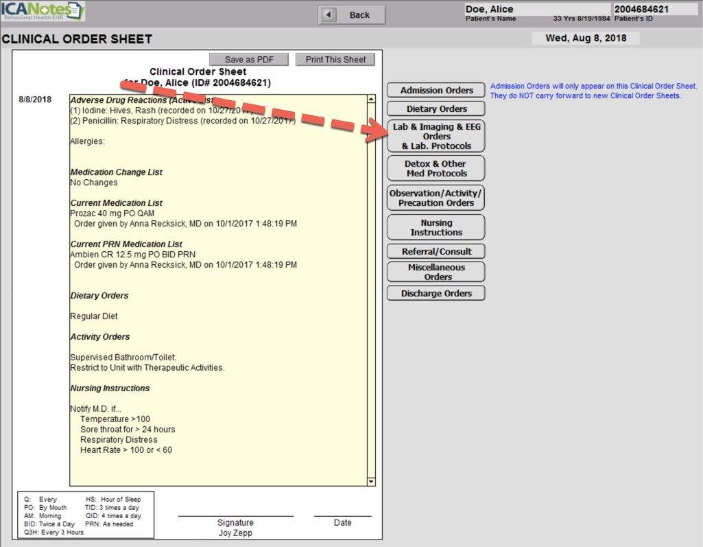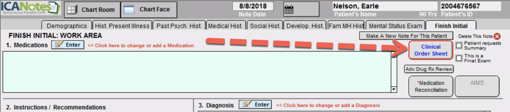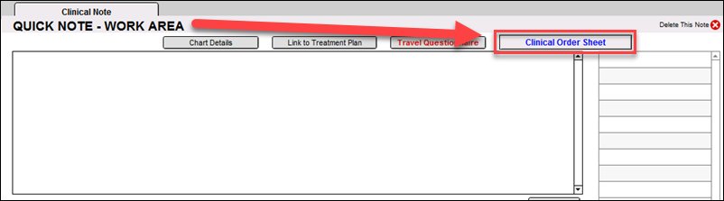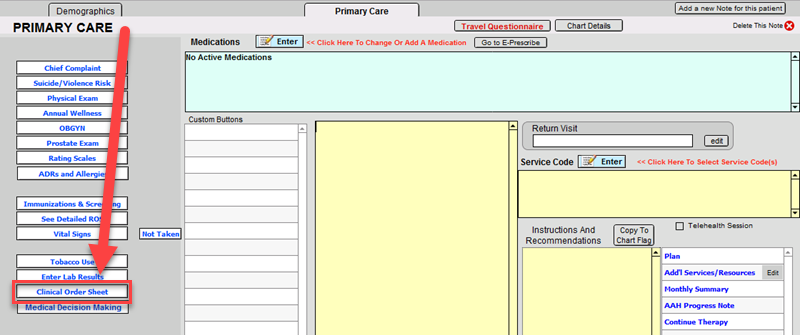 Anyone can order a lab as long as it has the provider's name as the ordering physician. The following note types have direct access to the Clinical Order Sheet: Complete Assessment, Prescriber Progress Note, Nursing Note, Primary Care Note, and the Quick Note.