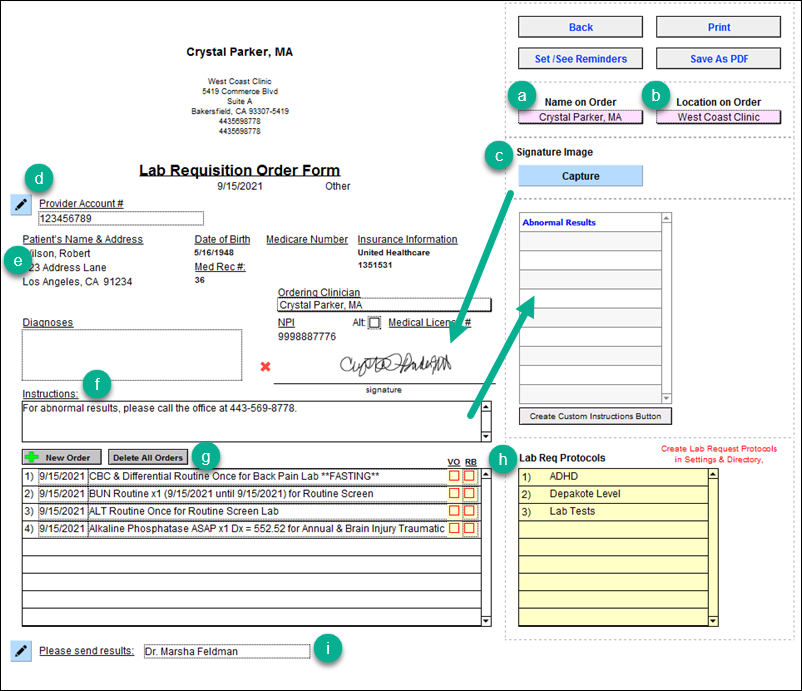 - Signature Image allows you to Capture the ordering clinician's signature for the lab request.