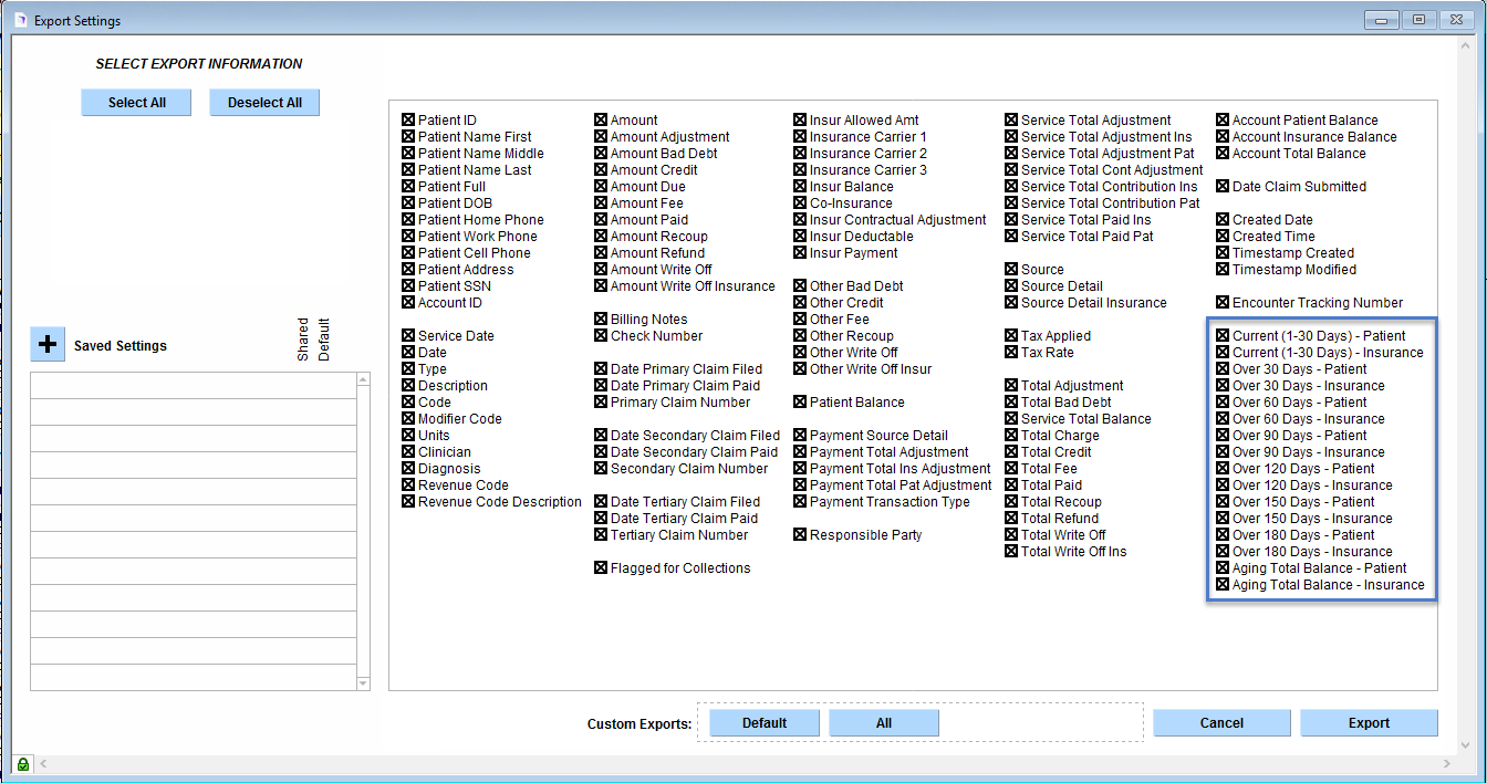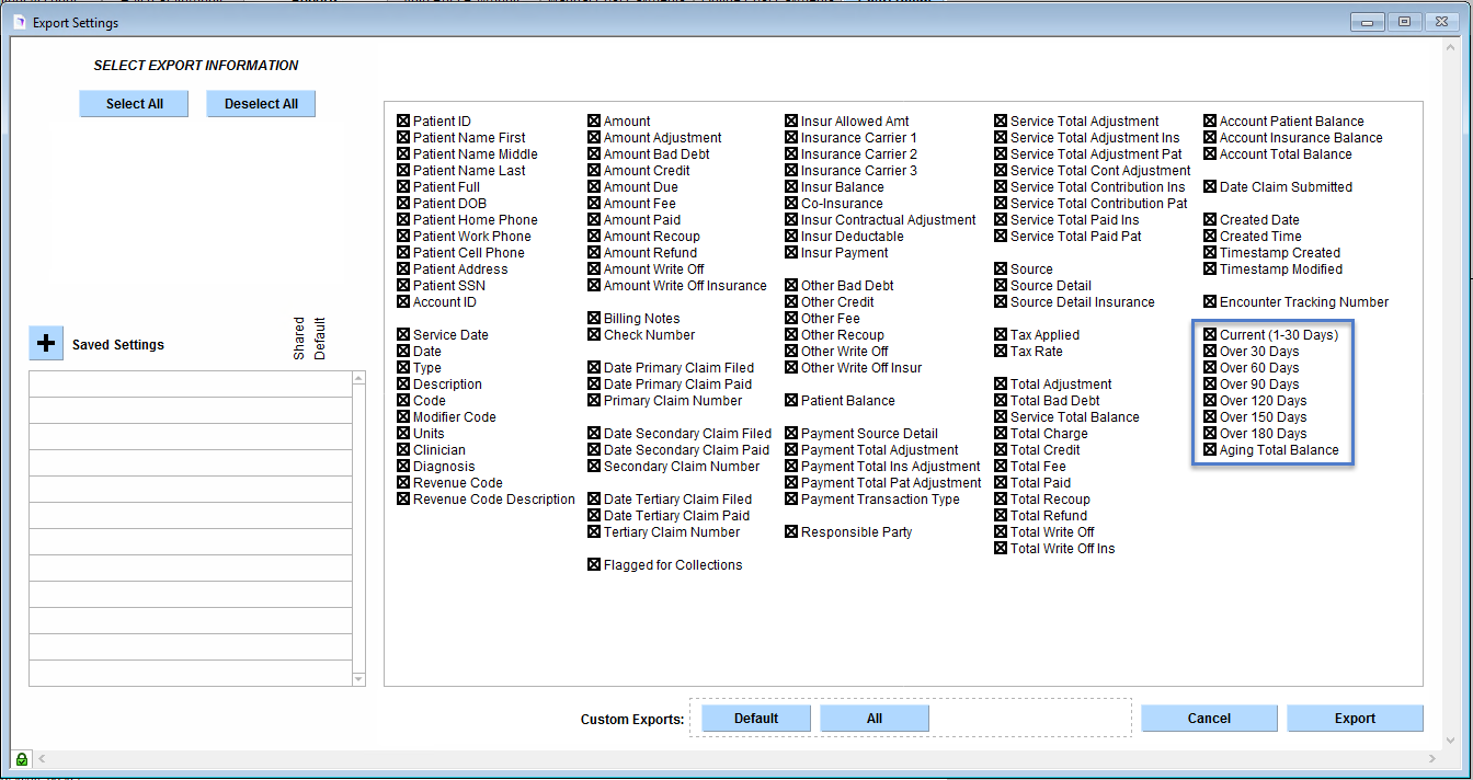The Patient Account aging reports information to export has new fields included to filter your information.
