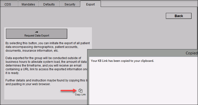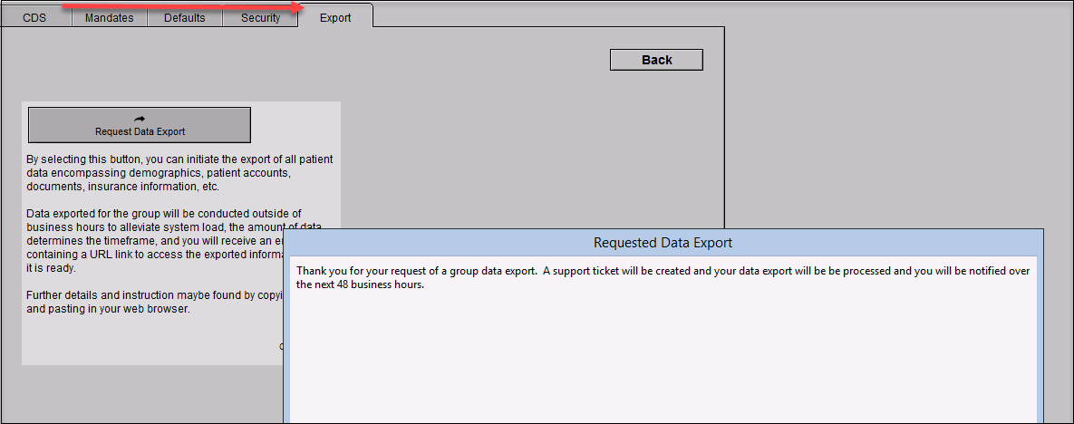 3. The Group Rules screen will now have a new 'Export' tab with the option to request a data export for all patients by clicking "Request Data Export". You will see a confirmation prompt about the request being successful.
