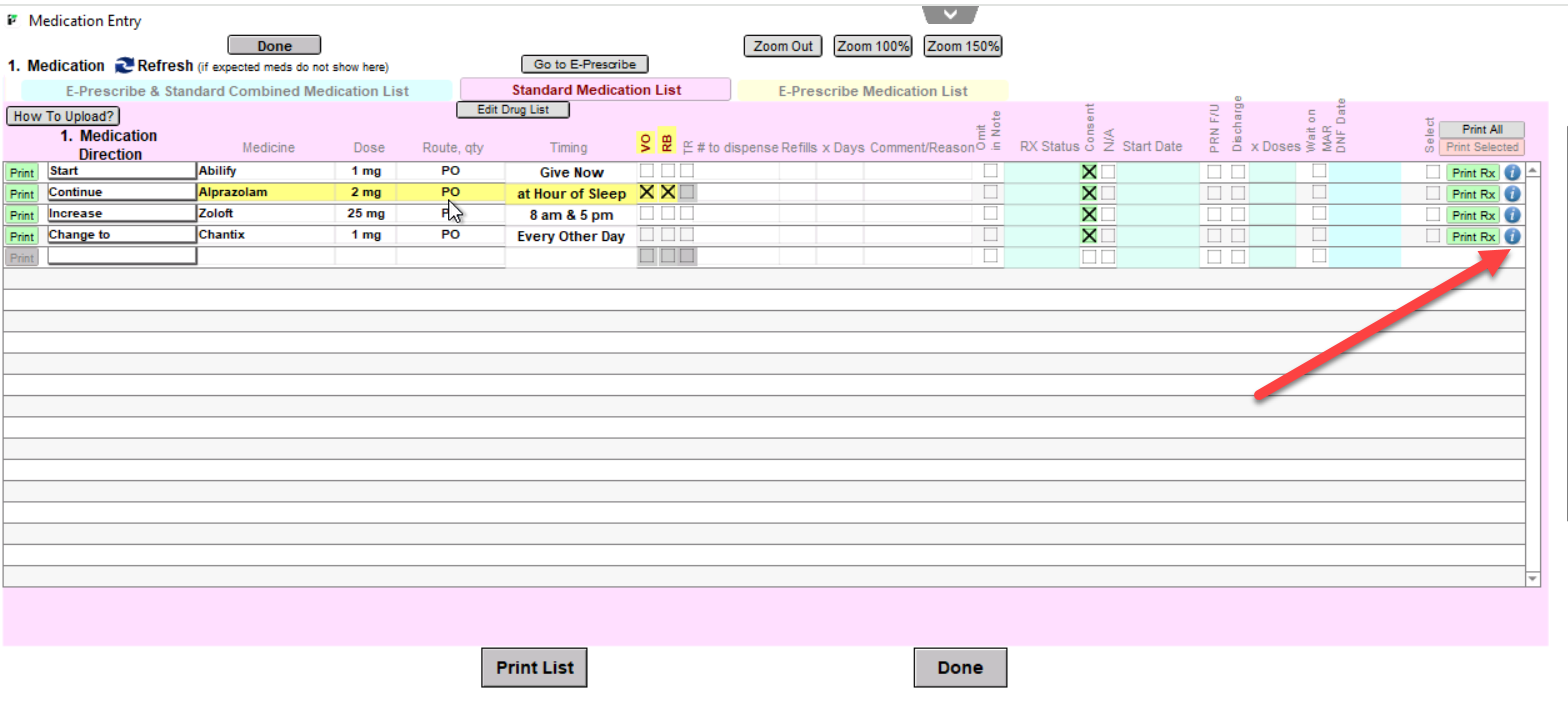 1. Click on the blue i icon on the right for the medication you would like to view.
