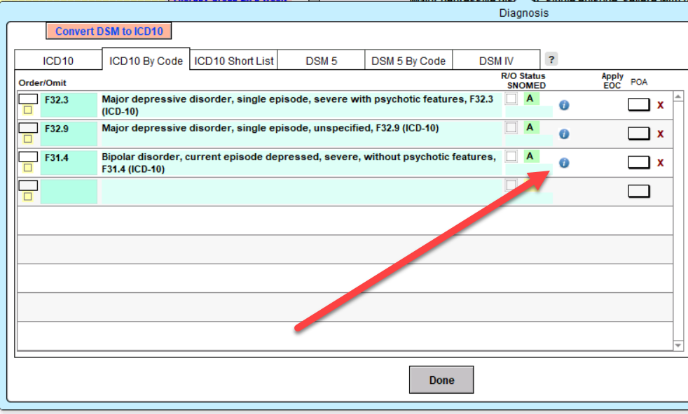 2. Click on the blue i icon on the right for the diagnosis you would like to view.