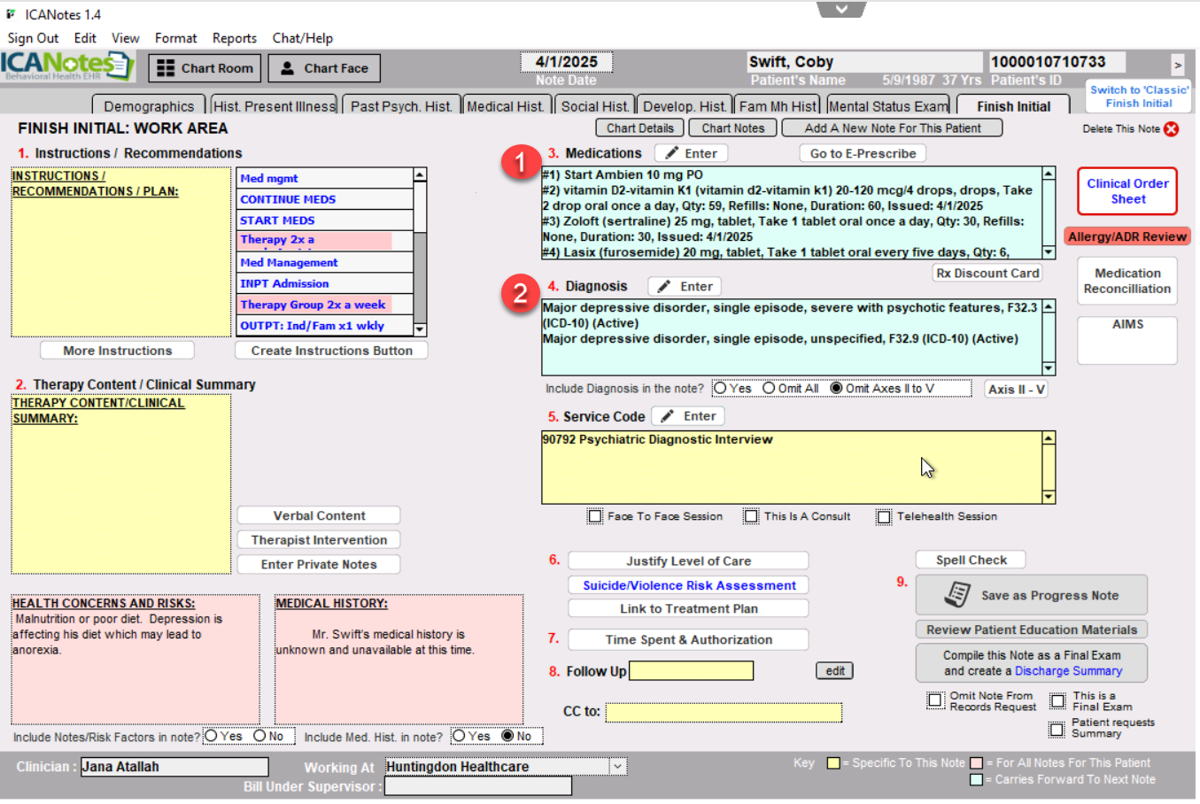 2. Click within the Diagnoses area (by clicking the Enter button) for users to access and print patient documentation for diagnoses.