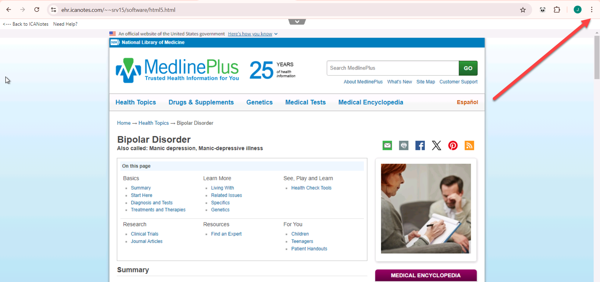 You will be brought to the MedlinePlus webpage where you will be able to print MedlinePlus webpage by clicking on the "Options Icon" to the top right of the browser and selecting the print option.