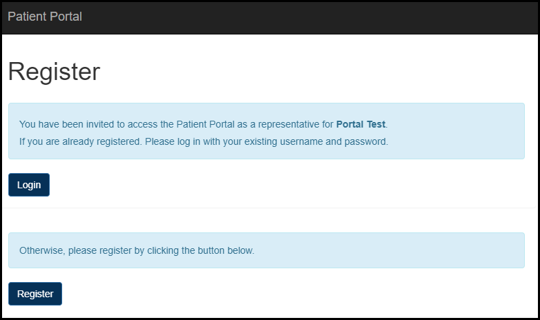 1. A portal owner can have access to multiple portal accounts. By clicking the registration link in their email, they will be brought to the Patient Portal Registration page. They will need to click