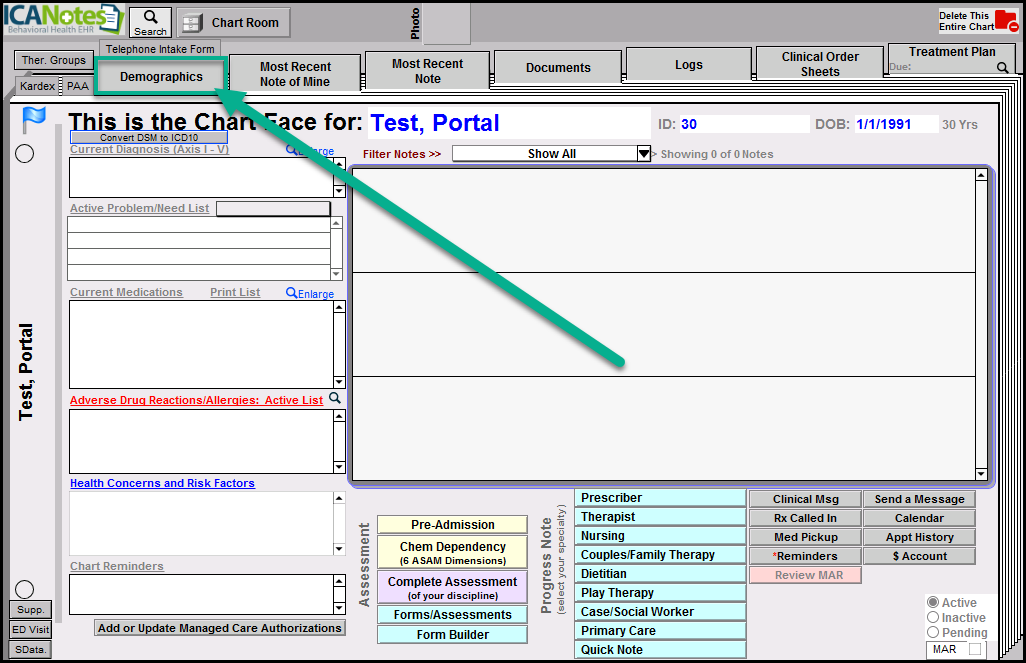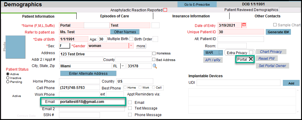 2. In Demographics, ensure that there is a valid email address in the Email field and that the patient is portal activated.