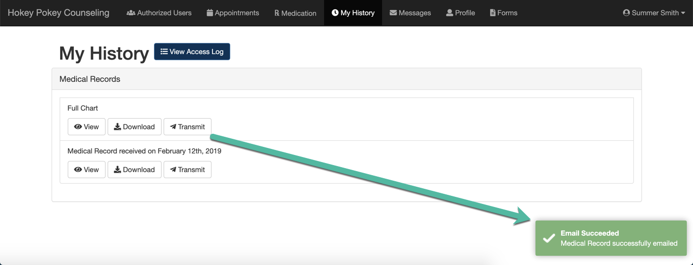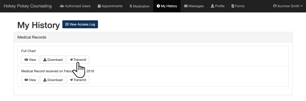1. From the My History tab, the patient will decide what to transmit. In this example, the patient has chosen to transmit the full chart. Click the tab.