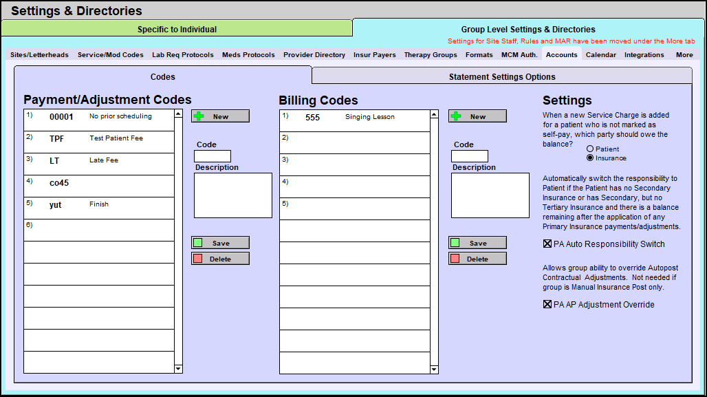 Payment/Adjustment Codes can be applied to insurance or patient payments, which can later be tracked within the various Patient Accounts reports. A user with Group Administrator access can create and modify Payment/Adjustment Codes in the Accounts tab in Group Level Settings and Directories.