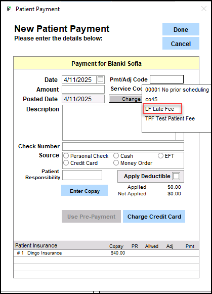 When posting a payment to the patient’s account, the code will be available for use in the Pmt/Adj Code dropdown.