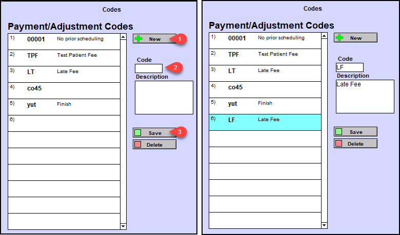 To create a new Payment/Adjustment Code, start by clicking the +NEW button (1), type in a Code and Description (2), then click to Save (3). The custom code will be added to the list of Payment/Adjustment codes.