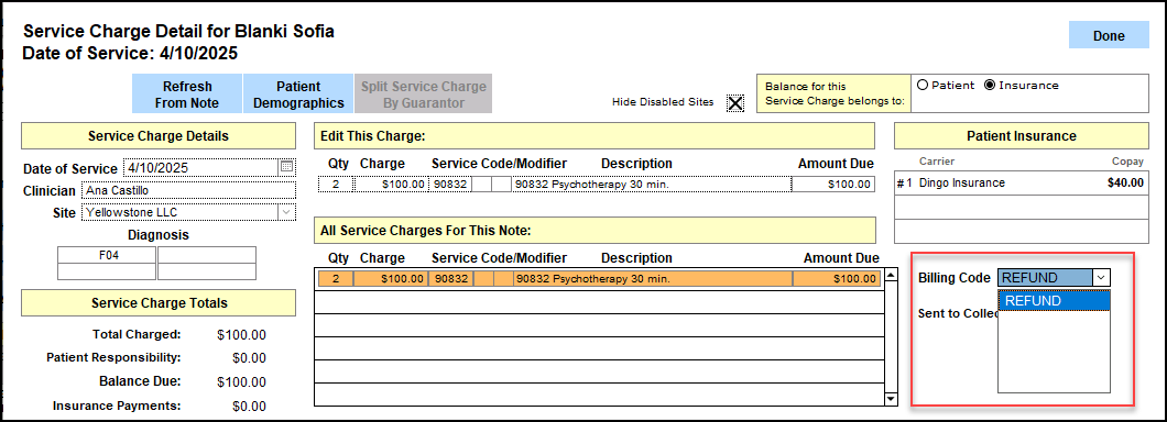 The code is now available to use within the Billing Code dropdown inside the Edit Service window in Patient Accounts.