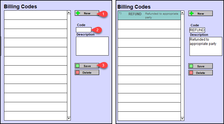 To create a new Billing Code, start by clicking the +NEW button (1), type in a Code and Description (2), then click to Save (3). The custom code will be added to the list of available Billing Codes.