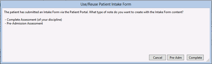Clicking either option to Use New Patient Intake Form or Reuse Patient Intake Form will prompt a dialog box giving you the choice to include the intake content in a Complete assessment or a Pre Admission Assessment. In such situations where an intake form has been submitted, but a different note type - such as a Progress Note - a dialog prompt will be displayed giving you the option to stop creation of the progress note in order to create a Complete Assessment incorporating the intake form content.