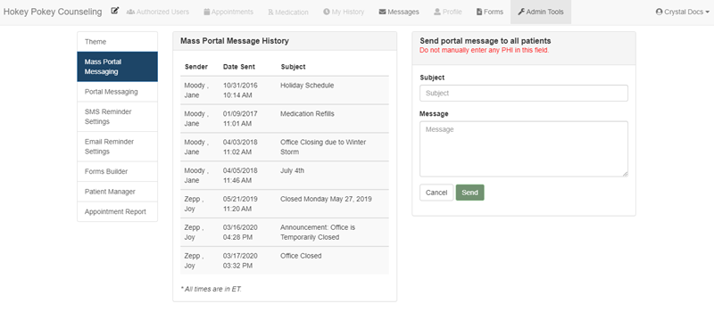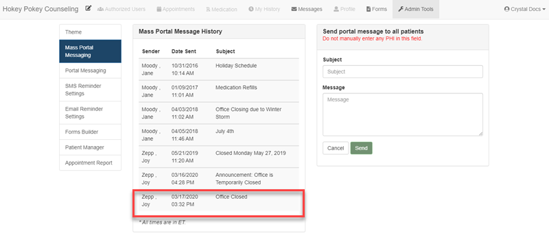 4. Your message will be sent to all patients who have registered for the patient portal and show the date sent under Portal message history.