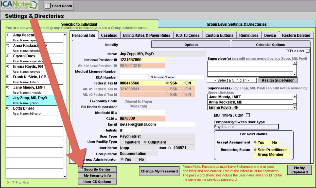 5. In the Security Center, find the name of the person who will take the role of Patient Portal Admin and click the button in the right column. (Note: If you are setting another user to be the Patient Portal Admin, the button will be grey .)