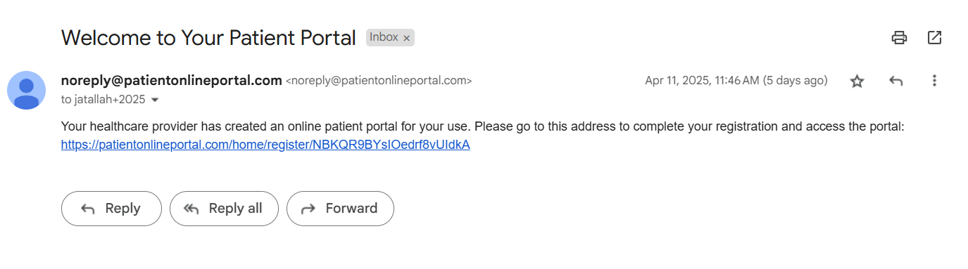 1. You will receive an email from noreply@patientonlineportal.com titled ‘Welcome to Your Patient Portal’. It will look something like this: