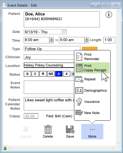 3. You will see the Copay documented. Click the More button in the bottom right.