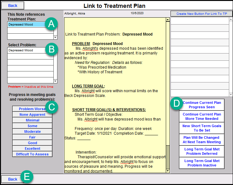 4. Complete the area by selecting the treatment plan (A), problem (B), progress (C), and plan for the patient (D). Once finished, click the 'Back' button (E).